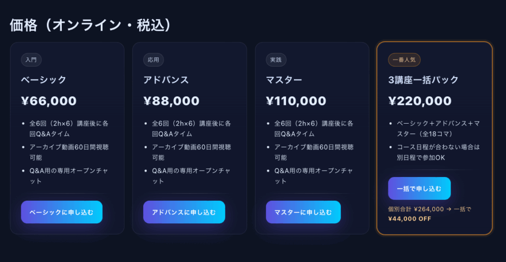 ただし、3講座をまとめて受講するのは大変!という方もいると思うので、まずはベーシック講座として66000円(税込)もご用意しました。